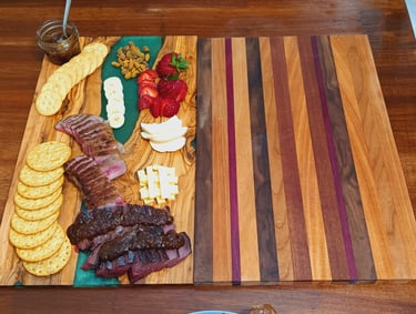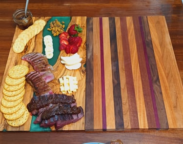 At GSB Woodcraft, we meticulously handcraft each cutting board to serve both as a reliable kitchen tool and an elegant charcuterie display. Our boards are designed to seamlessly transition from food prep to entertaining, adding a touch of sophistication to any gathering. Crafted from select hardwoods like Mesquite, Olive and Acacia, each piece is unique—no two boards are ever the same. The artistry and attention to detail ensure that your board is not just functional, but also a one-of-a-kind conversation piece.